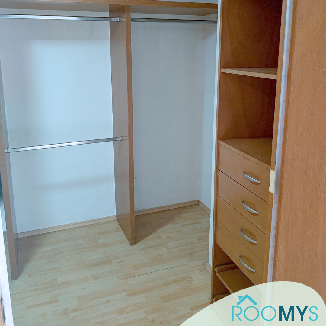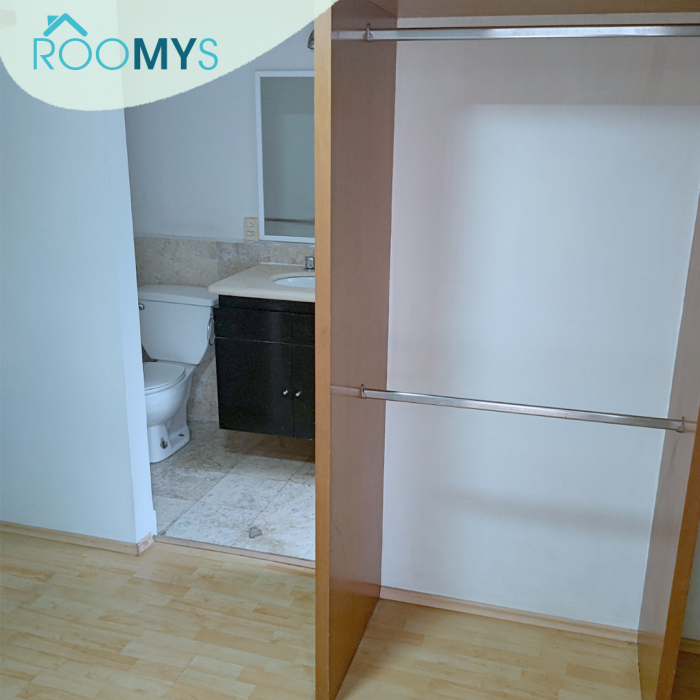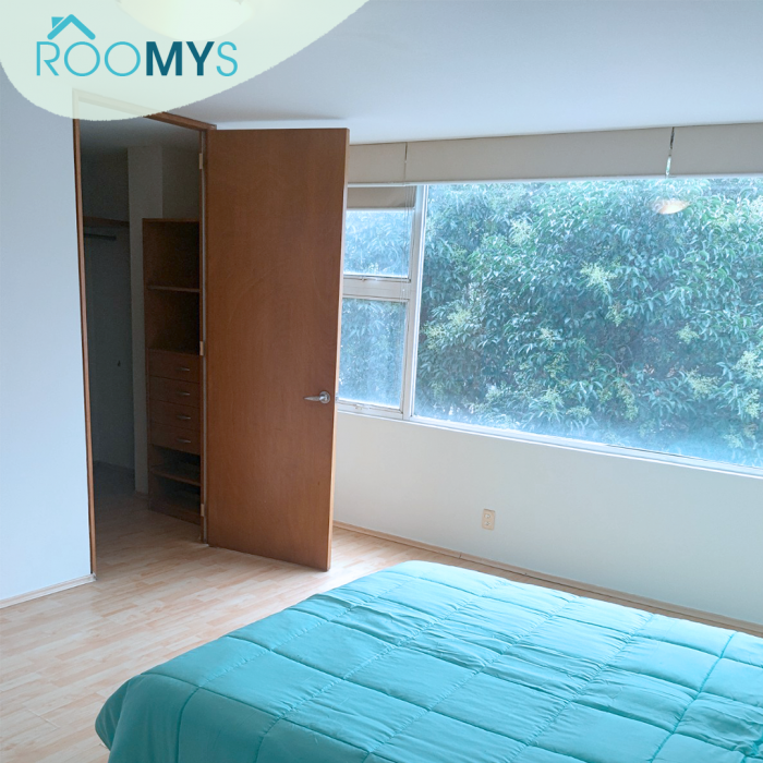 Habitación con Cama Matrimonial, Walking Closet amplio y Baño propio. Dentro de un departamento con acabados modernos, totalmente amueblado y ubicado en la mejor zona de la Colonia Roma Sur, a unas calles de Insurgentes y Metro Chilpancingo.