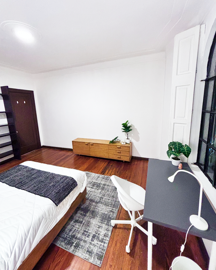 La habitación cuenta con Cama Matrimonial Premium , Clóset amplio 🧥, Mesita Auxiliar, Escritorio 👨💻 y Baño compartido con tina 🚿.