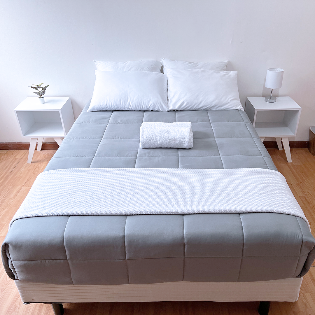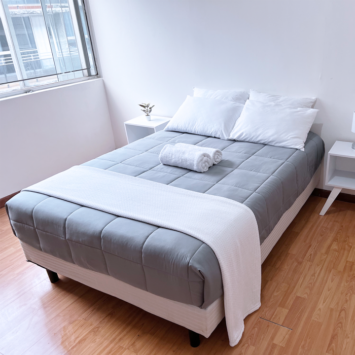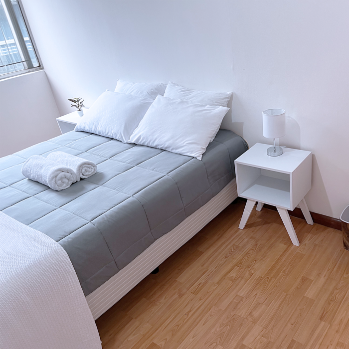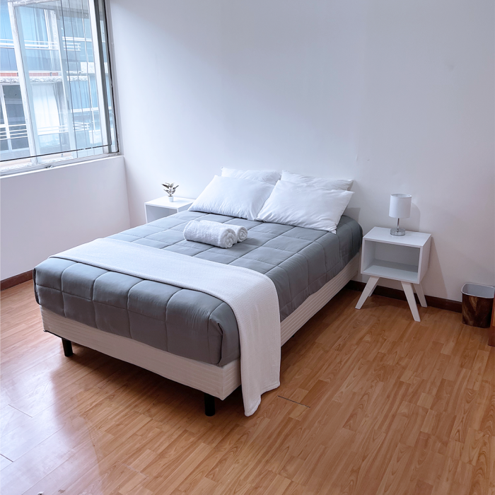 La habitación cuenta con Cama Matrimonial🛏️, Clóset muy amplio, Mesita Auxiliar, Escritorio y Baño compartido con una persona.