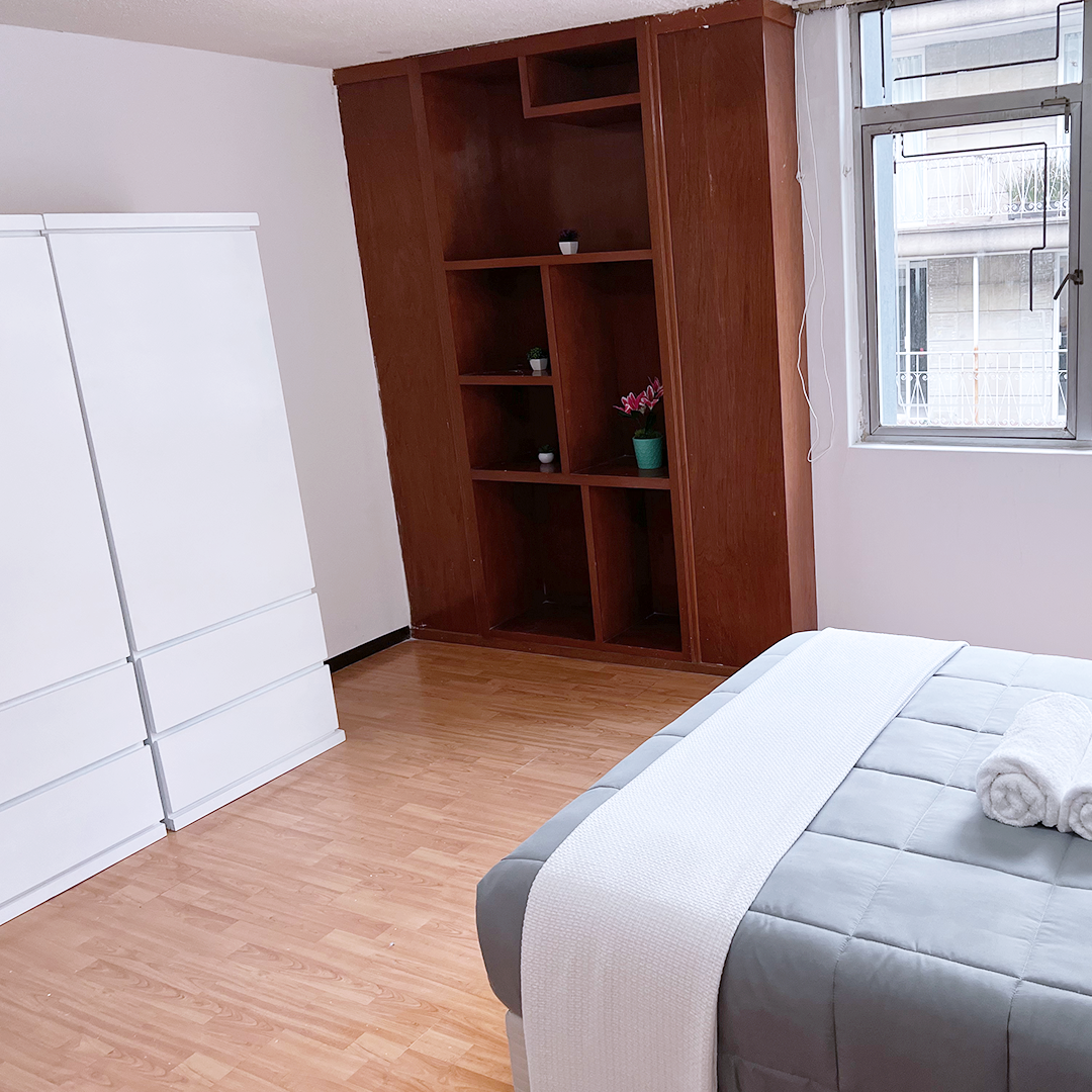 Habitación con Cama Matrimonial, Closet y Baño compartido. Dentro de un departamento Pendhouse con acabados modernos, totalmente amueblado y ubicado en la mejor zona de la Colonia Polanco, a unos metros Periférico.