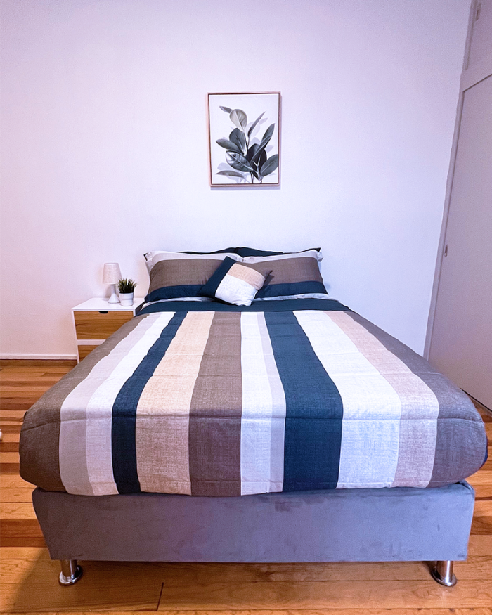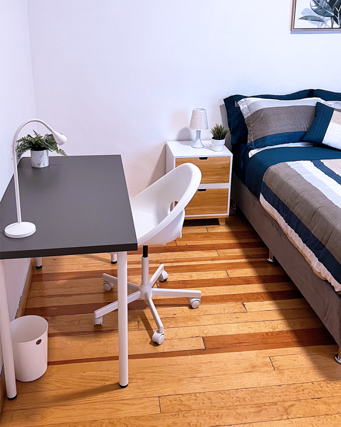 Habitación con Cama Matrimonial, Clóset, Escritorio y Baño compartido. Dentro de un departamento con acabados modernos, totalmente amueblado y ubicado en la mejor zona de la Colonia Cuauhtémoc, a unas calles de Reforma.