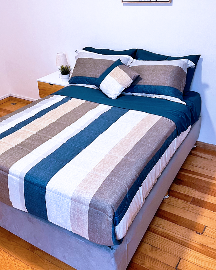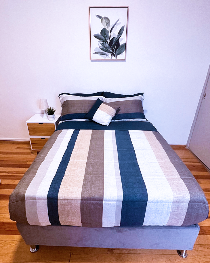 La habitación cuenta con Cama Matrimonial, Clóset, Mesita Auxiliar, Escritorio y Baño compartido. El departamento esta totalmente amueblado y cuenta con Cocina Integral, Lavadora y Secadora, Sala, Comedor, TV, Horno de Microondas, 3 Baños completos, Internet de Alta Velocidad con 100 Megas.