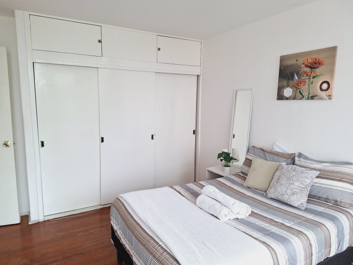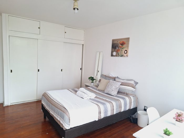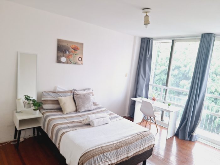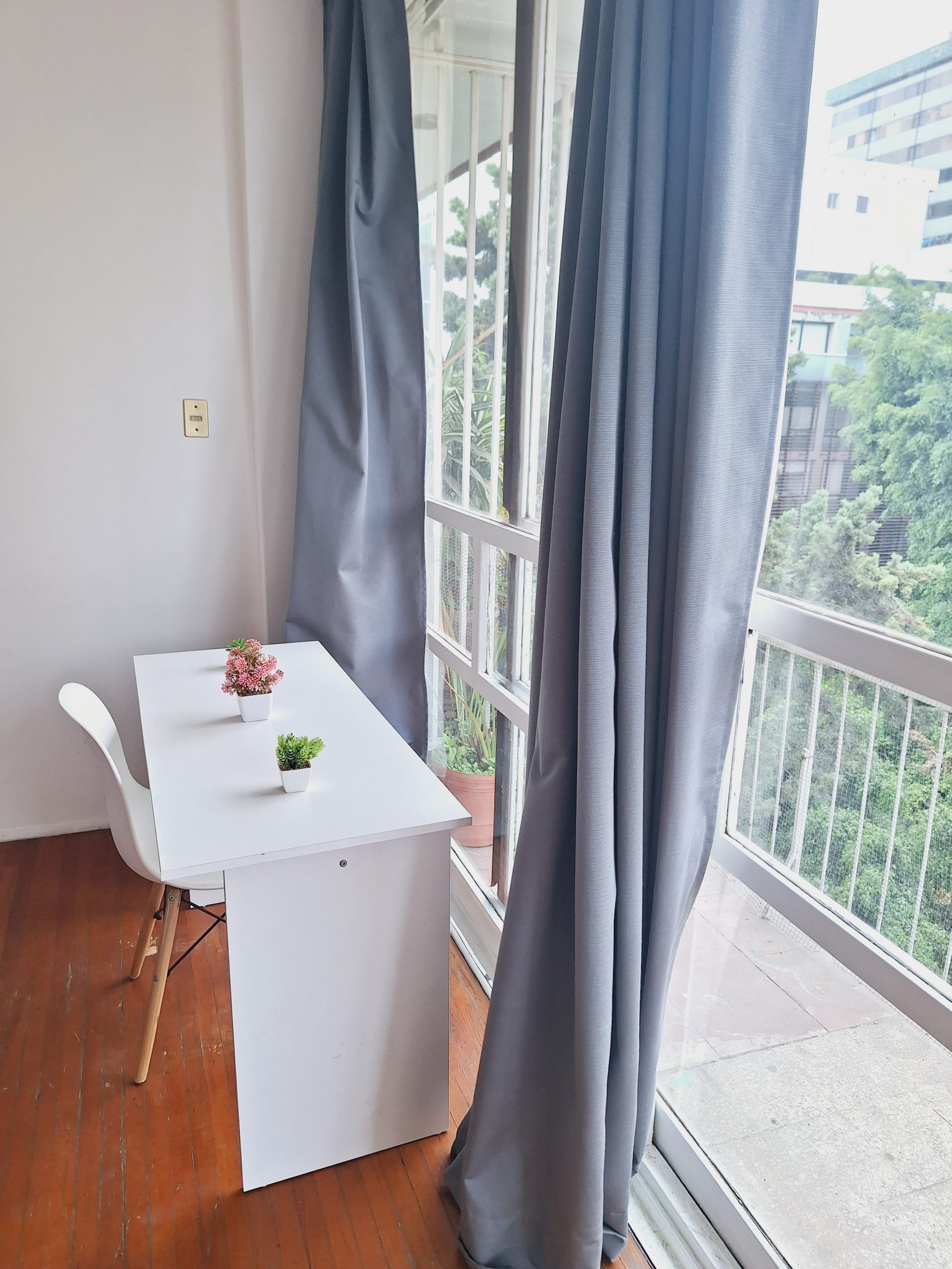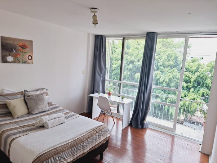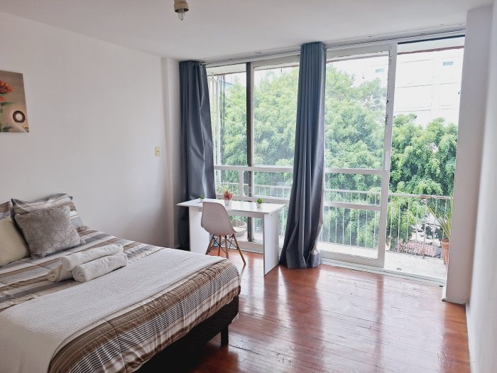 La habitación cuenta con Cama Matrimonial🛏️, Clóset con amplio, Terraza🏙, Mesita Auxiliar, Escritorio 👨💻y Baño compartido🛁. El departamento esta totalmente amueblado y cuenta con Cocina Integral, Lavadora, Sala, Comedor, TV, Horno de Microondas, Licuadora, 2 1/2 Baños completos, Internet de Alta Velocidad con 100 Megas.