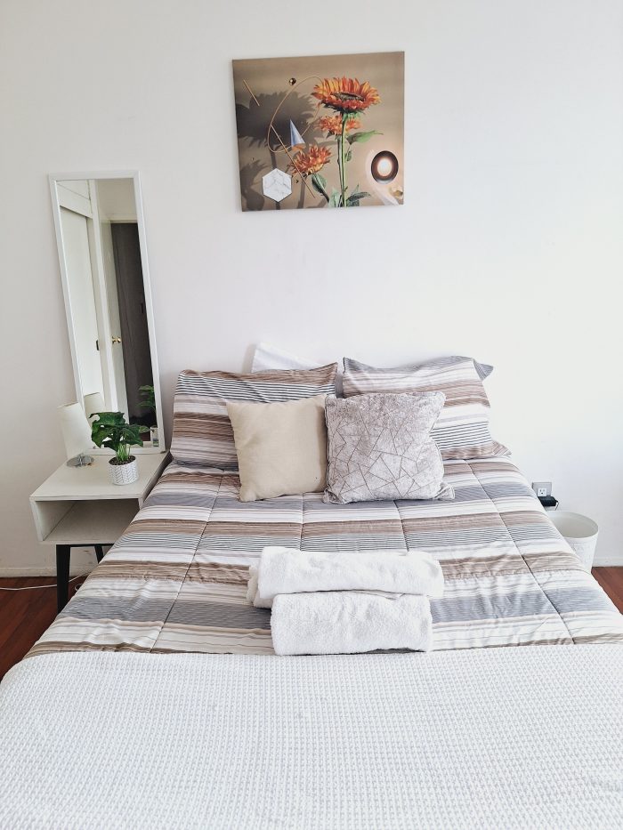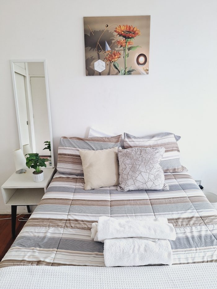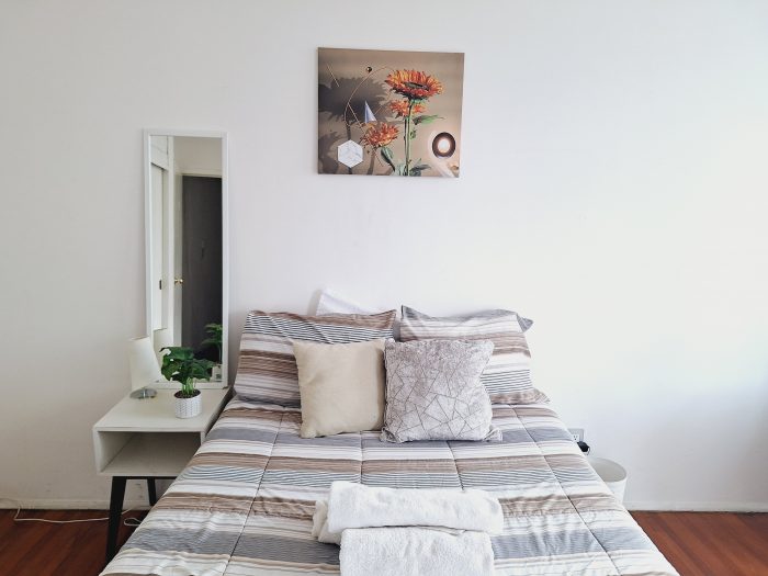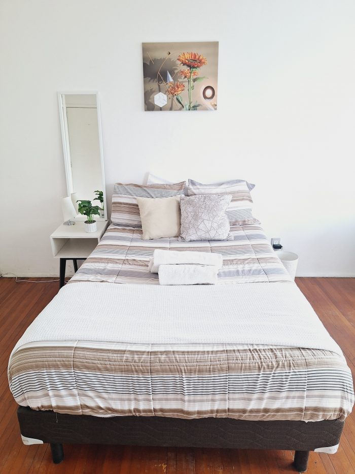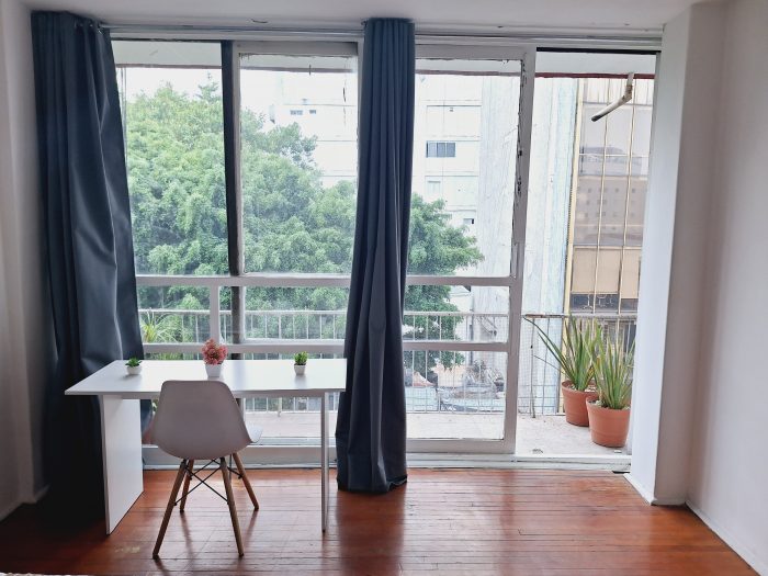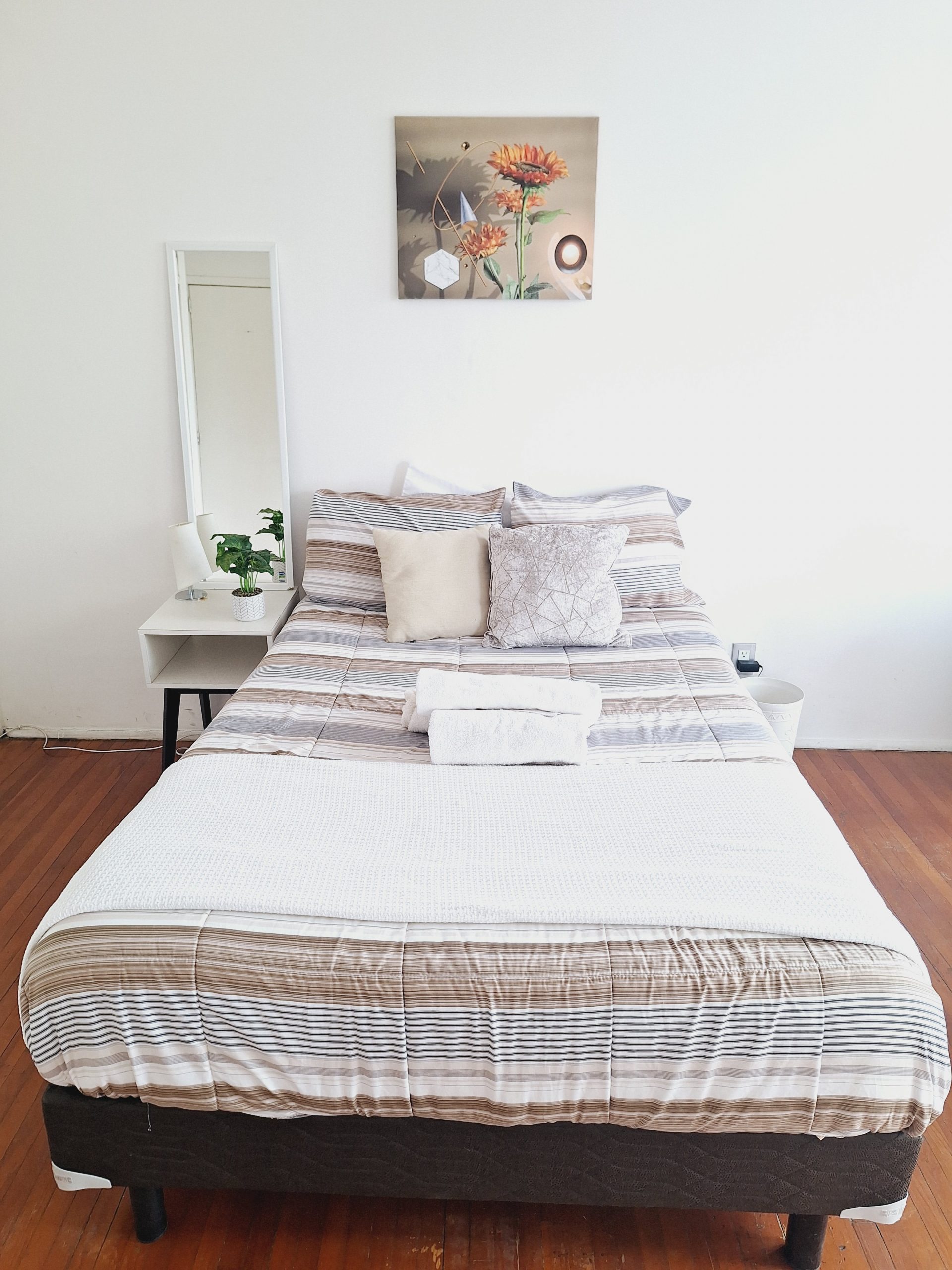 La habitación cuenta con Cama Matrimonial🛏️, Clóset con amplio, Terraza🏙, Mesita Auxiliar, Escritorio 👨💻y Baño compartido🛁. El departamento esta totalmente amueblado y cuenta con Cocina Integral, Lavadora, Sala, Comedor, TV, Horno de Microondas, Licuadora, 2 1/2 Baños completos, Internet de Alta Velocidad con 100 Megas.