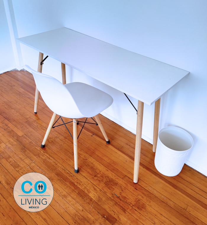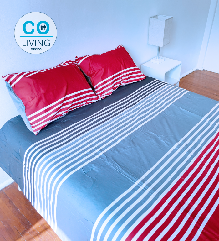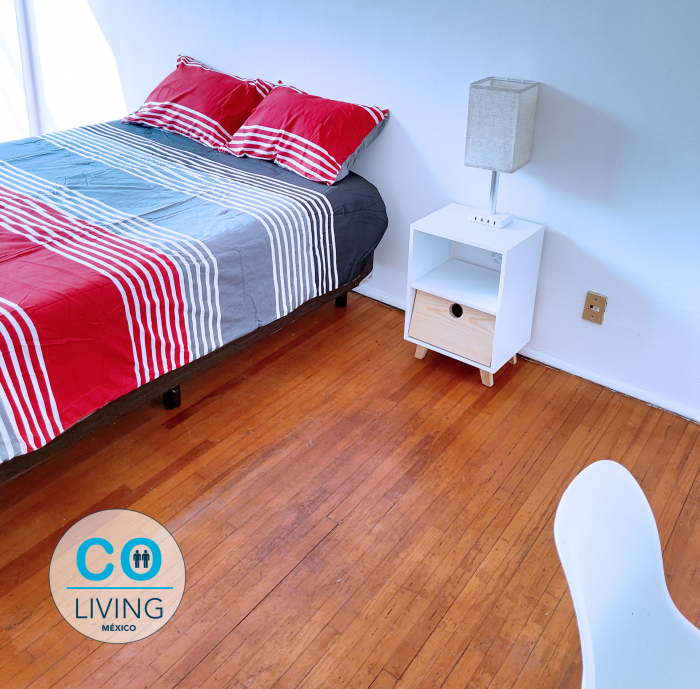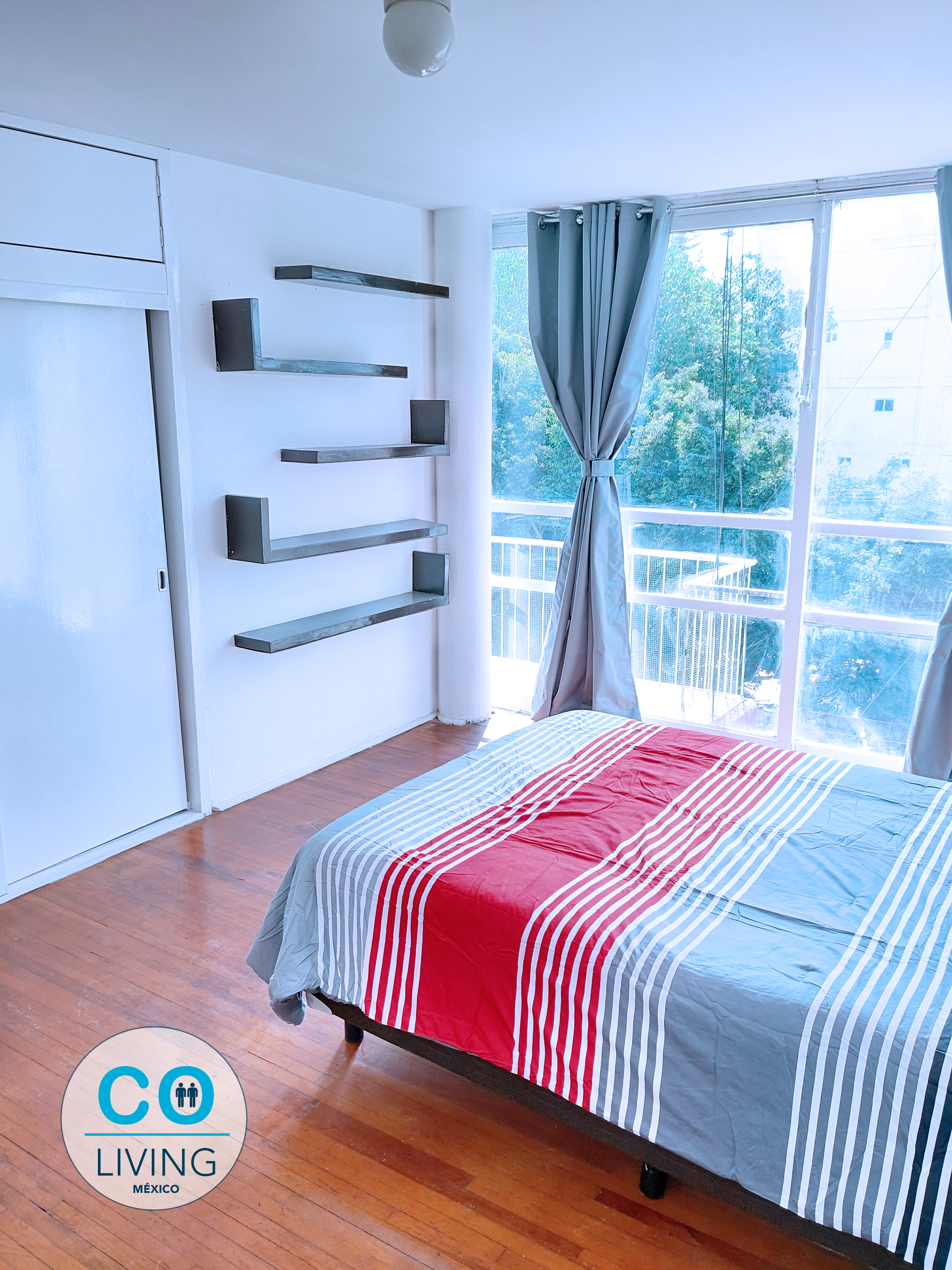 Habitación con Cama Matrimonial, Clóset amplio , Escritorio, Terraza y Baño compartido. Dentro de un departamento con acabados modernos, totalmente amueblado y ubicado en la mejor zona de la Colonia La CONDESA , a unas calles de Insurgentes y Metro Chilpancingo.