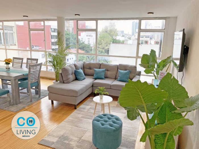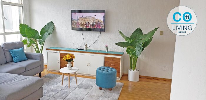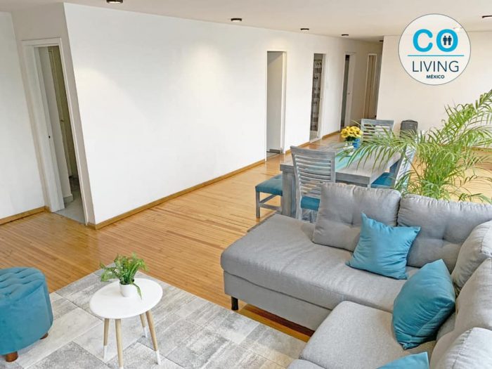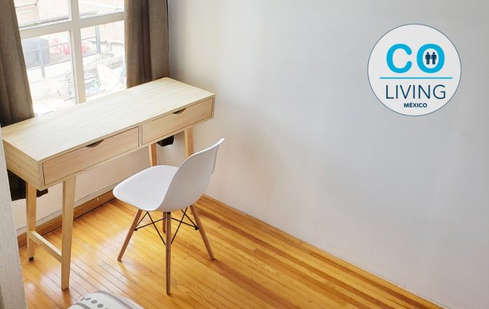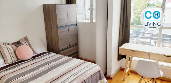 Habitación con Cama Matrimonial, Closet y Baño compartido. Dentro de un departamento con acabados modernos, totalmente amueblado y ubicado en la mejor zona de la Colonia Roma Sur, a unas calles de Insurgentes y Metro Chilpancingo.