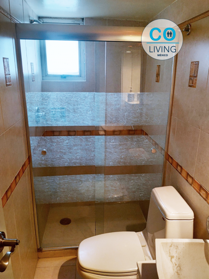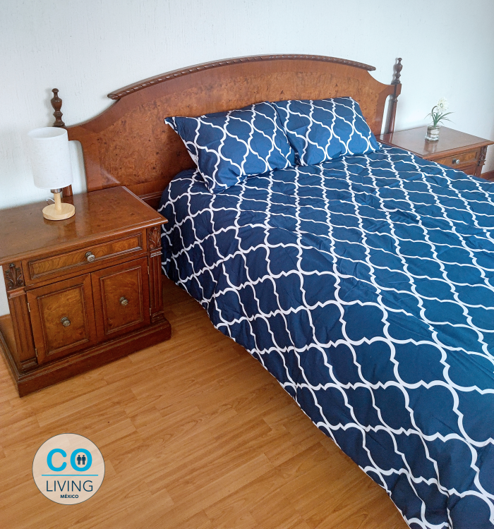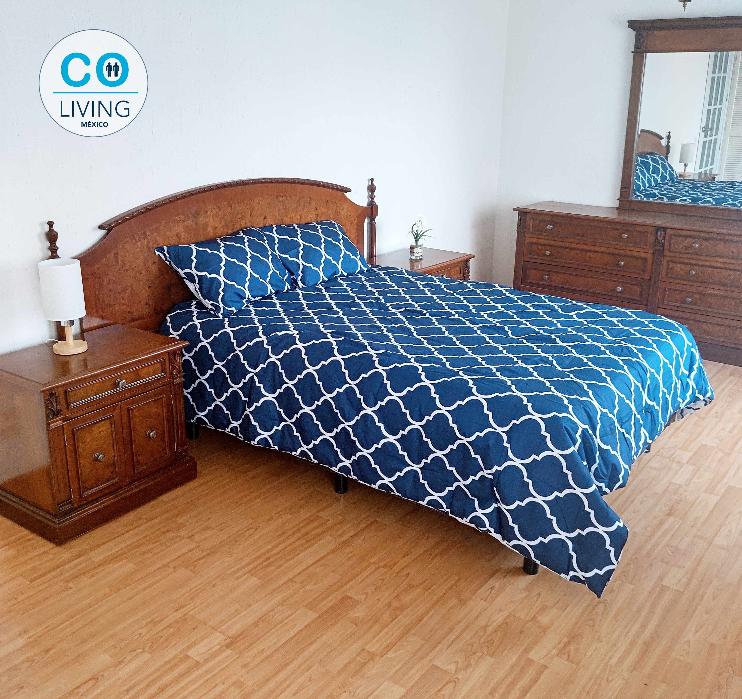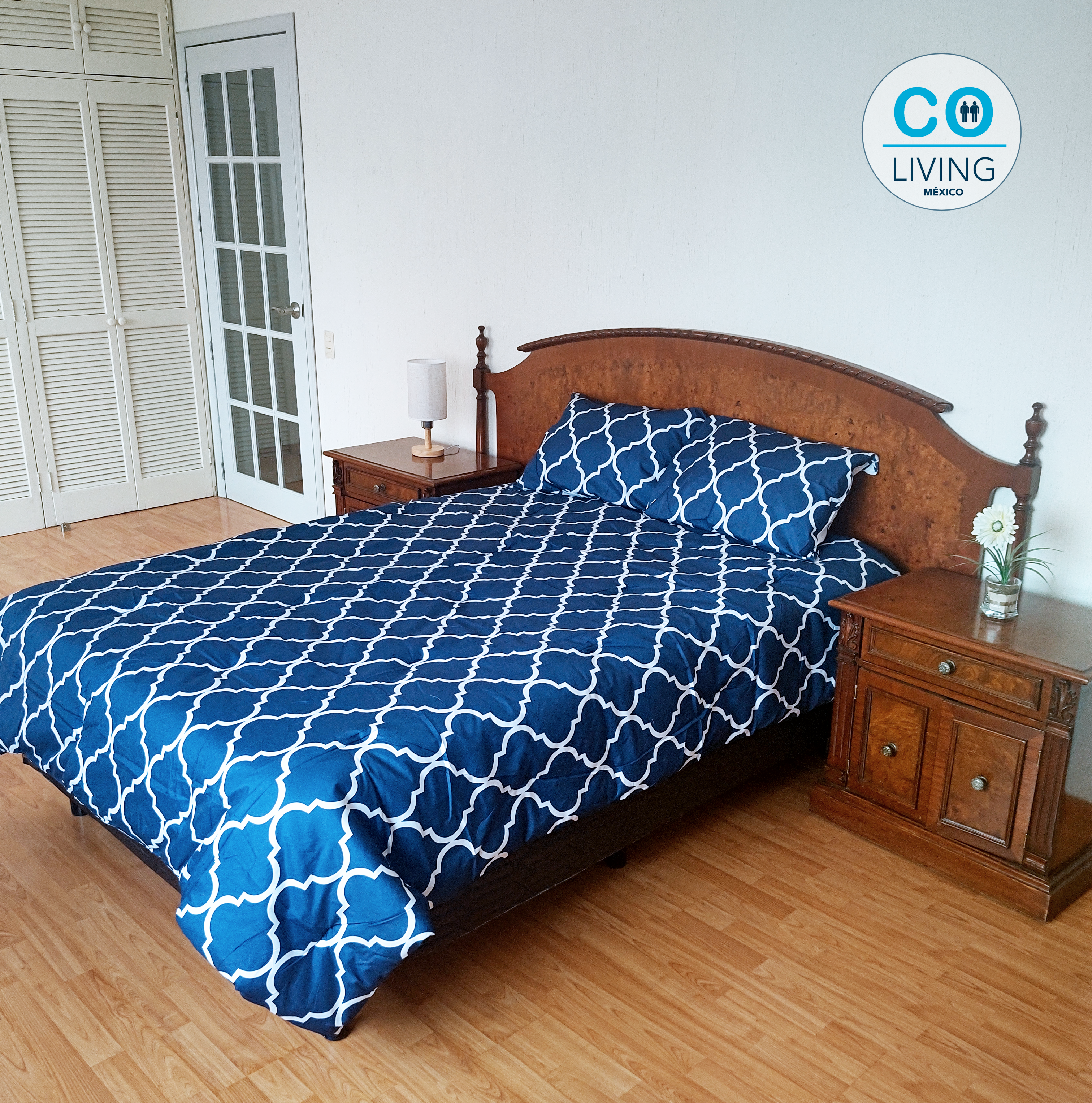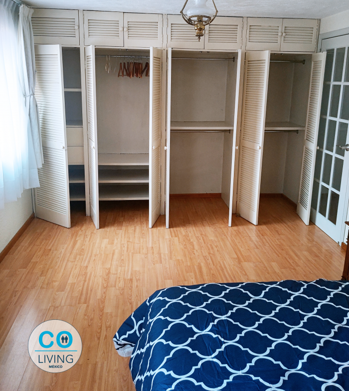 La habitación cuenta con Cama Matrimonial, Clóset muy amplio, Mesas auxiliares, , Tocador, Escritorio y Baño propio(Opcion para pareja costo adicional). El departamento esta totalmente amueblado y cuenta con Cocina Integral, Lavadora, Secadora, Sala, Comedor, Estudio, Área de Lavado, TV, Horno de Microondas, 4 Baños completos, Internet de Alta Velocidad con 100 Megas.
